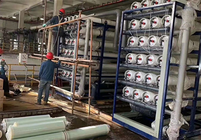 2、EDI膜堆主要由交替排列的阳离子交换膜、浓水室、阴离子交换膜、淡水室和正、负电极组成。在直流电场的作用下,淡水室中离子交换树脂中的阳离子和阴离子沿树脂和膜构成的通道分别向负极和正极方向迁移,阳离子透过阳离 子交换膜,阴离子透过阴离子交换膜,分别进入浓水室形成浓水。同时EDI进水中的阳离子和阴离子跟离子交换树脂中的氢离子和氢氧根离子交换,形成超纯水(高纯水)。极限电流使水电解产生的大量氢离子和氢氧根离子对离子交换树脂进行连续的再生。传统的离子交换,离子交换树脂饱和后需要化学间歇再生。而EDI膜堆中的树脂通过水的电解连续再生,工作是连续的,不需要酸碱化学再生。